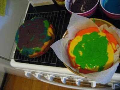 It's all finished cooking now and I'm debating whether to actually layer them or just have them as two cakes. With two cakes, it means that more people can partake of the hypercoloured wonder that is the Rainbow Cake. Might even do two different types of icing for it or something like that. We'll see. I'm letting the cakes cool at the moment.